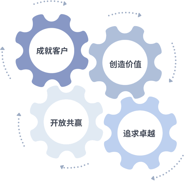 成就客户是一切决策的出发点,,,创造价值是衡量所有工作的标准,,,,追求卓越是我们做事做人的态度,,开放共赢是我们的格局也是最终的结果。。价值观的齿轮环环相扣,,,,推动着组织里的每个人不断向前。。。。